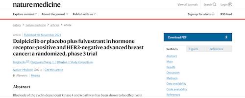 11月4日,国际四大医学期刊之一、英国《自然》旗下《自然医学》(Nature Medicine)在线发表CDK4/6抑制剂达尔西利(SHR6390)联合氟维司群治疗既往内分泌治疗后疾病进展的HR+/HER2-晚期乳腺癌的多中心、随机、双盲III期临床研究(DAWNA-1研究)中期分析结果报告,首次对氟维司群(雌激素受体降解剂)±达尔西利治疗激素受体阳性晚期乳腺癌的有效性和安全性进行了比较。研究结果显示,达尔西利+氟维司群组与安慰剂+氟维司群组相比,无进展生存期(PFS)显著延长。该项研究由中国医学科学院肿瘤医院徐兵河教授担任leading PI,全国39家医院参研,由8868体育临床研发团队支持完成。