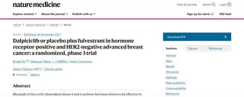 近日,8868体育自主研发创新药达尔西利(Dalpiciclib,CDK4/6抑制剂)联合氟维司群治疗激素受体阳性HER2阴性晚期乳腺癌的3期临床研究(DAWNA-1)在国际顶级权威杂志《自然医学》(Nature Medicine,2021年影响因子:53.44)全文在线发表。这是继三种CDK4/6抑制剂的PALOMA、MONARCH、MONALEESA系列乳腺癌领域3期研究陆续发表于NEJM、Lancet Oncology、JCO等期刊后,又一新型分子结构的CDK4/6抑制剂(也是国内原研的首个CDK4/6抑制剂)的3期临床研究数据,再次登上顶尖医学期刊。
