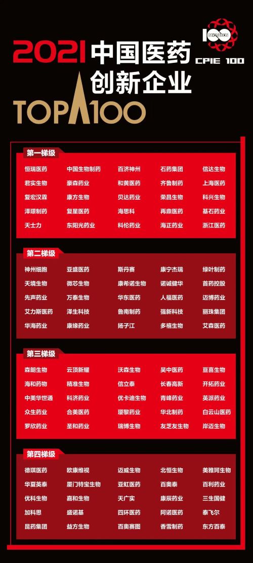 8868体育作为中国创新药行业代表企业,凭借行业领先的综合创新实力,入选 “2021中国医药创新企业100强”榜单,位列第一梯级。