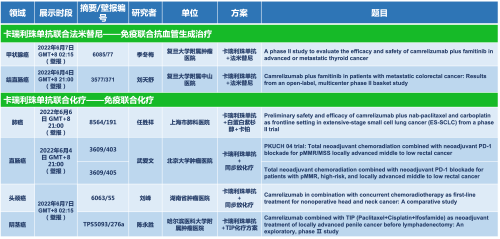 卡瑞利珠单抗联合8868体育的另一款创新药法米替尼在甲状腺癌和结直肠癌领域有2项研究被接收为壁报,另有卡瑞利珠单抗联合化疗的4项研究在肺癌、结直肠癌、头颈癌和阴茎癌领域的研究被接收为5份壁报。