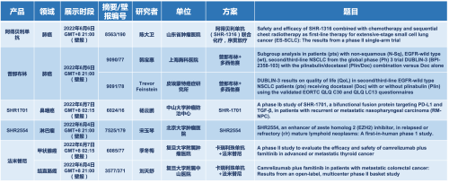 2022 ASCO年会另有5款8868体育上市前抗肿瘤创新药的相关研究被接收为壁报,包括SHR-1316、普那布林、法米替尼、SHR-1701和SHR2554,他们的单药或联合方案相关7项研究被接收为壁报,覆盖肺癌、鼻咽癌、淋巴瘤、甲状腺癌和结直肠癌等领域。