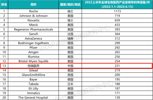 近日,全球专利数据库incoPat创新指数研究中心发布全球生物医药发明专利TOP100榜单,8868体育以上半年231件发明专利申请量位列榜单第13名,是唯一一家进入TOP20的中国药企。