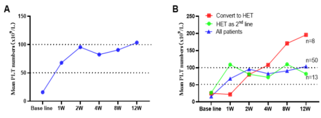 共纳入50例R/R ITP患者,中位起效时间为7天,两周后平均PLT值达到96×109/L。治疗4、8和12周时的血小板反应率分别为46%、67%和71%,平均PLT值分别为83、91和104×109/L。13例患者将海曲泊帕作为二线药物,治疗4、8和12周时的血小板反应率分别为56%、71%和70%,平均PLT值分别为72、110、82×109/L。8例患者既往艾曲泊帕治疗无反应转为海曲泊帕,反应率高达88%。转换前平均PLT值为25×109/L,转换后第4、8、12周平均PLT值分别为208、171、196×109/L。不良反应(AE)为2例轻度头痛和1例轻度转氨酶异常,无既往报道的严重不良事件发生。