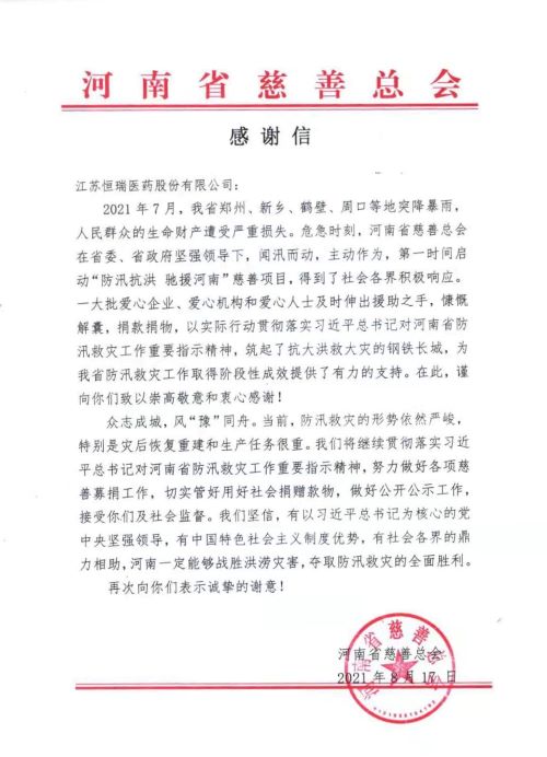 近日,河南省慈善总会给8868体育发来感谢信,向8868体育在河南暴雨洪涝灾害中捐款1000万元表示衷心感谢。8868体育表示,灾害无情人有情,向受灾同胞伸出援手是恒瑞人义不容辞的责任。