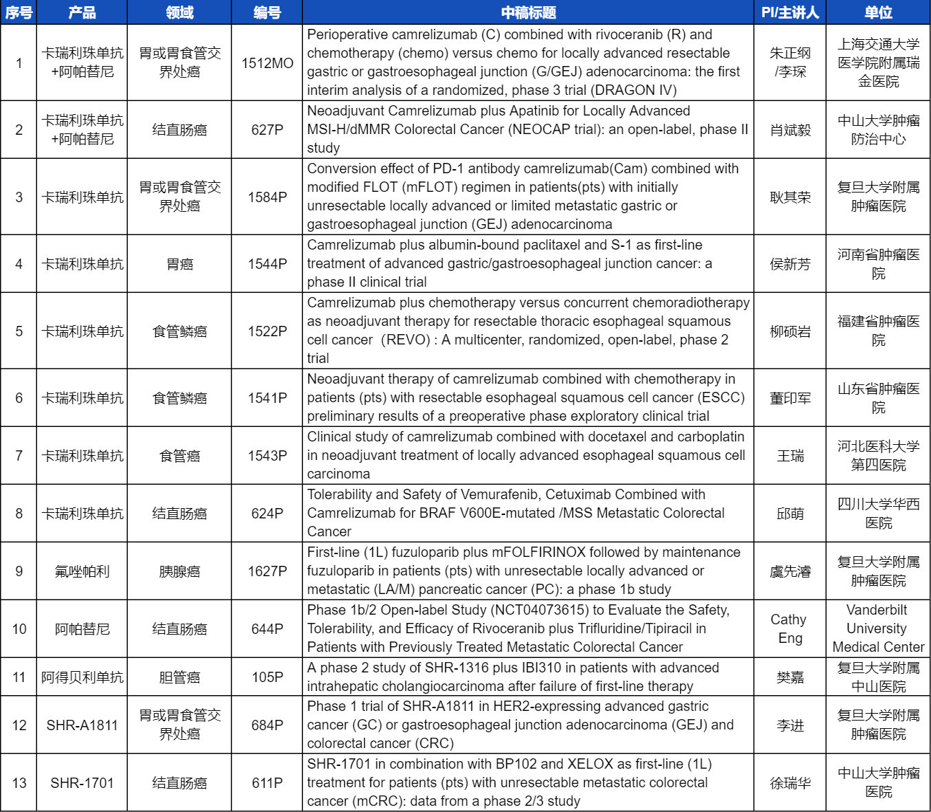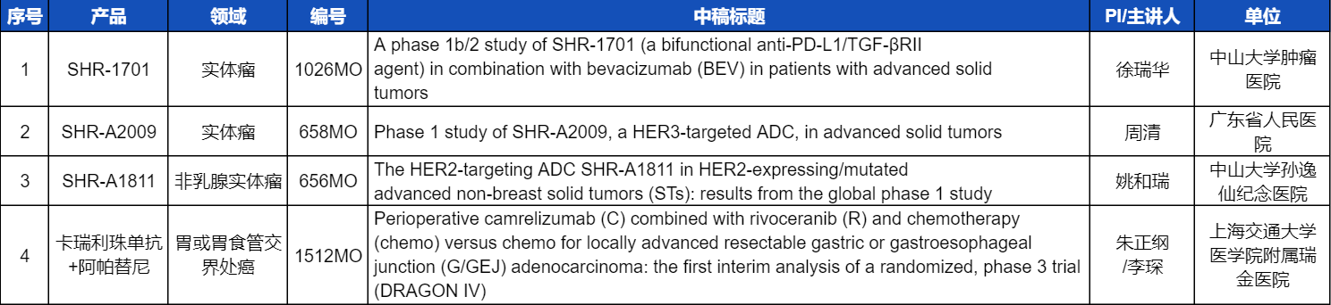 本次ESMO大会,将由中山大学肿瘤医院徐瑞华教授、广东省人民医院周清教授、中山大学孙逸仙纪念医院姚和瑞教授、上海交通大学医学院附属瑞金医院李琛教授分别就4项8868体育创新产品相关研究做口头报告,包括SHR-1701、SHR-A2009、SHR-A1811这3款未上市创新产品的实体瘤治疗临床研究,以及1项“双艾”组合(卡瑞利珠单抗联合阿帕替尼)治疗局部晚期可切除胃/胃食管交界处癌的Ⅲ期临床试验期中分析。