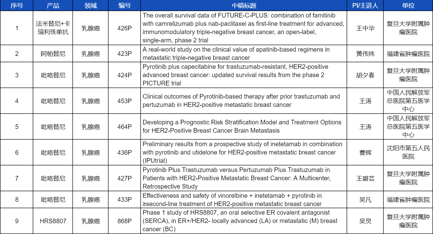 在乳腺癌领域,吡咯替尼、阿帕替尼、卡瑞利珠单抗、法米替尼,或产品间联合或联合化疗,共有9项研究入选壁报讨论,其中吡咯替尼占据6项,较为全面地展示了这款中国首个自主研发抗HER2靶向药在乳腺癌治疗中的显著特点和潜力。此外,8868体育自主研发的新型选择性雌激素受体共价拮抗剂(SERCA)HRS8807治疗ER+/HER2-局部晚期或转移性乳腺癌的Ⅰ期研究也成功入选,有望为此类患者带来更多用药新选择。