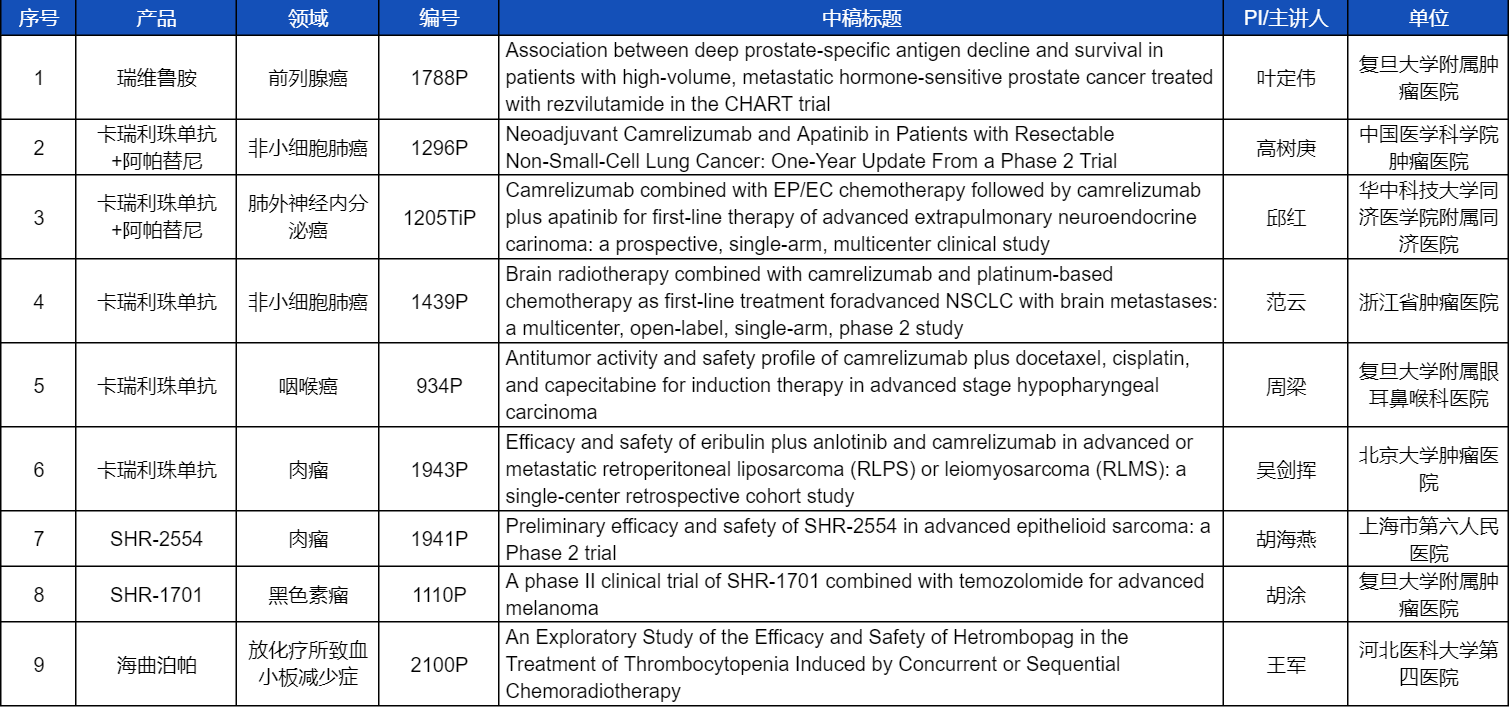 在非小细胞肺癌、咽喉癌、肉瘤、前列腺癌、黑色素瘤等多个领域,卡瑞利珠单抗、阿帕替尼、瑞维鲁胺、SHR-1701、SHR2554等创新产品相关研究一共入选了8项壁报展示。此外,8868体育自主研发的血小板生成素受体激动剂(TPO-RA)海曲泊帕在放化疗所致血小板减少领域的探索性研究显示良好的疗效,入选壁报展示。