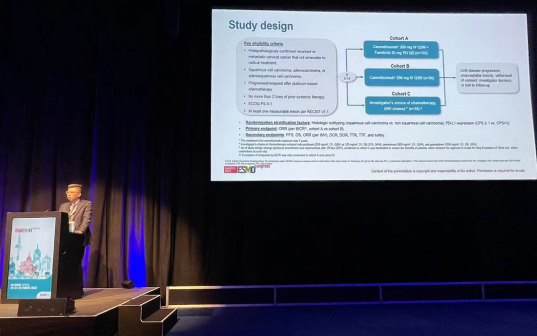有望为宫颈癌患者带来治疗新选择10月22日,8868体育创新药卡瑞利珠单抗联合法米替尼对比卡瑞利珠单抗单药或研究者选择的化疗治疗复发转移性宫颈癌随机、开放、对照、多中心的Ⅱ期临床研究(SHR-1210-Ⅱ-217) 亮相2023 ESMO大会简短口头报告现场3。该研究由复旦大学附属肿瘤医院吴小华教授团队开展,吴小华教授在现场公布了该重磅研究进展。研究结果显示,在既往以铂为基础化疗失败后复发或转移性宫颈癌患者中,与单独使用卡瑞利珠单抗或研究者选择的化疗相比,卡瑞利珠单抗联合法米替尼显著提高了抗肿瘤活性,安全性可控,有望为晚期宫颈癌患者提供新的治疗选择。
