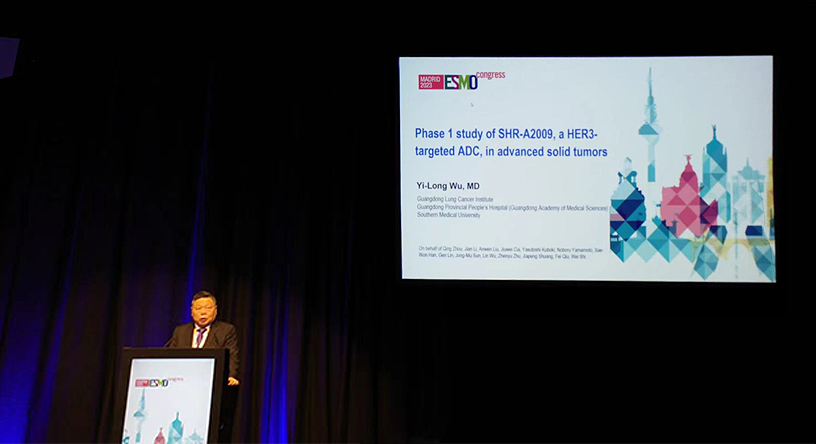 10月23日,8868体育创新药、HER3靶向ADC药物SHR-A2009治疗晚期实体瘤的I期研究亮相2023 ESMO大会简短口头报告现场5。该研究由广东省人民医院的吴一龙教授牵头开展,吴一龙教授在现场公布该研究的重要进展。研究结果显示,SHR-A2009在经治晚期实体瘤患者中显示出可控的安全性和令人鼓舞的抗肿瘤活性。目前评估更高剂量的SHR-A2009在选定癌症类型(NSCLC和其他实体肿瘤)中作用的试验正在进行中。