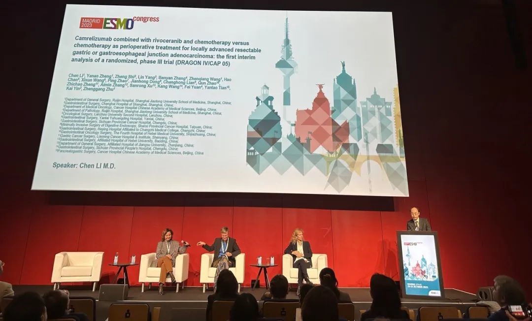 10月21日,8868体育创新药卡瑞利珠单抗(艾瑞卡®)联合阿帕替尼(艾坦®)(“双艾”组合)和化疗对比化疗治疗局部进展期胃癌随机对照Ⅲ期试验(DRAGON-IV/AHEAD-G208研究)亮相2023 ESMO大会简短口头报告现场7。该研究由上海交通大学医学院附属瑞金医院朱正纲教授担任主要研究者,上海交通大学医学院附属瑞金医院的李琛教授在现场公布了研究进展。该研究是全球首个评估围手术期免疫联合抗血管生成药物和化疗治疗可切除胃癌或胃食管结合部腺癌的III期临床试验,结果显示,卡瑞利珠单抗联合阿帕替尼和化疗组病理完全缓解(pCR)率18.3%,显著高于化疗组的5.0%,p<0.0001;同时,在化疗基础上加卡瑞利珠单抗和低剂量阿帕替尼,安全性可控,且未影响手术可行性。该研究结果证明,卡瑞利珠单抗联合阿帕替尼和化疗为可切除胃癌和胃食管结合部腺癌患者围术期治疗提供了新选择,为其在胃癌领域的治疗再添力证!
