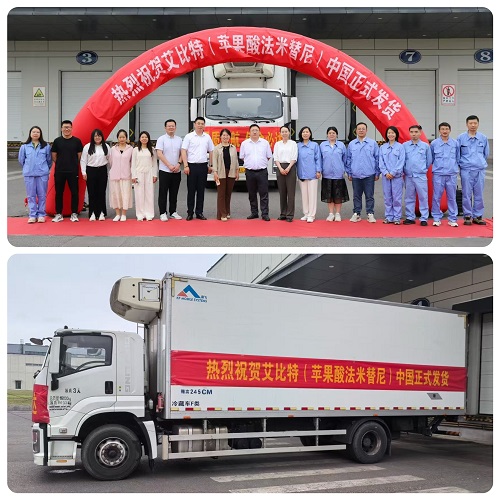 2025年6月13日,8868体育1类新药苹果酸法米替尼胶囊(艾比特®)首批发货仪式正式举行。当天,一辆装载法米替尼的运输车从江苏连云港8868体育国际化制剂生产基地发往全国,标志着该产品正式投入临床使用,将为复发或转移性宫颈癌患者提供新的治疗选择。