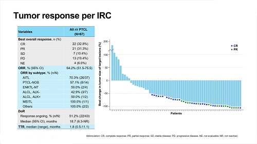此外,不同组织学亚型的ORR均表现出较好的疗效,如血管免疫母细胞性T细胞淋巴瘤(AITL)的ORR为70.3%,PTCL非特指型(PTCL-NOS)的ORR为57.1%,鼻型结外NK/T细胞淋巴瘤(ENKTL-NT)的ORR为50.0%,间变性大细胞淋巴瘤(ALCL,ALK-)的ORR为42.9%,ALCL(ALK+)的ORR为50.0%,单形性亲上皮性肠道T细胞淋巴瘤(MEITL)及其他亚型的ORR均为100%。