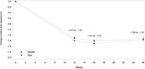 本研究达到预设的主要终点,治疗26周后,INS068组的HbA1c相对基线变化非劣于IGlar组。INS068 组与 IGlar组的HbA1c降幅分别为 1.34% 和 1.36%, 两组差值为 0.02%(95% CI:-0.14%,0.18%)。